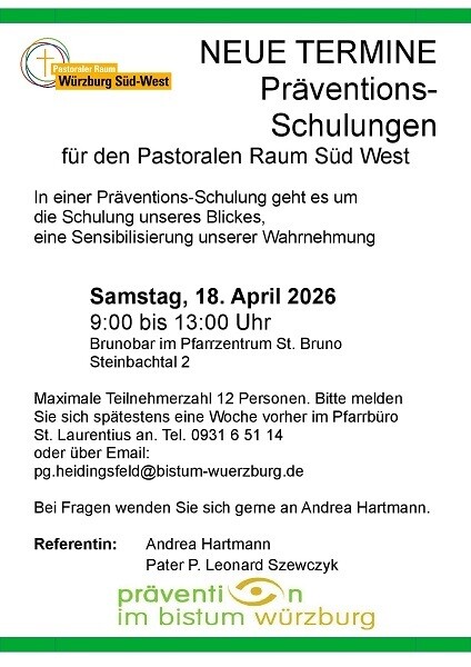 Im Bistum Würzburg und in unserem Pastoralen Raum Würzburg Süd-West wollen wir eine sichere Kirche für alle sein. Diese Haltung bedeutet ein klares Bekenntnis zu Prävention, Intervention und Aufarbeitung sexualisierter Gewalt in der Kirche. In allen Pastoralen Räumen gibt es darum Angebote, um die Ehrenamtlichen zur Sensibilität zu schulen, die es braucht, um missbräuchliches Verhalten zu erkennen und darin nicht ohnmächtig, sondern handlungsfähig zu werden. Daher wollen wir Sie auf untenstehende Präventionsschulung aufmerksam machen, die wir erneut in der nächsten Zeit anbieten: