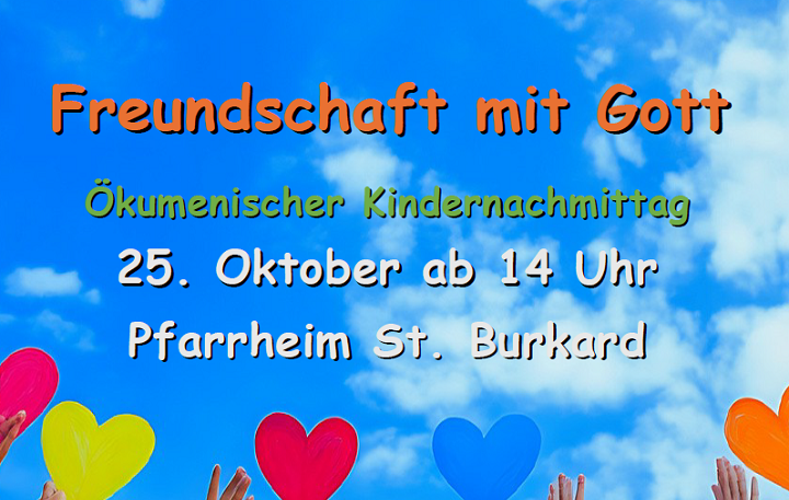 Herzliche Einladung zum ökumenischen Kinderkirchennachmittag in St. Burkard am 25.10.2025. Eingeladen sind alle Kinder ab 6 Jahren. Dort wollen wir spannende Geschichten hören, Singen, Spielen, Basteln, Essen und vieles andere mehr.