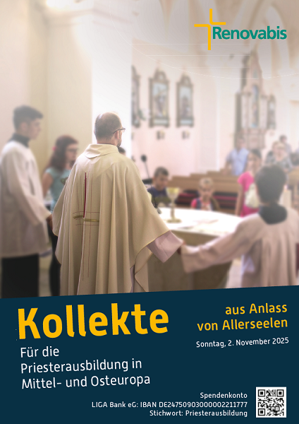 Am Sonntag, dem 2. November 2025 dient die Kollekte in allen katholischen Kirchen in Deutschland der Unterstützung der Priesterausbildung in Mittel- und Osteuropa. Für die Kirche in den ehemals kommunistischen Ländern Mittel-, Ost- und Südosteuropas ist die Priesterausbildung nach wie vor von großer Bedeutung: Seelsorge ist gefragt und gefordert, die Hilfe und der Beistand von Priestern, Ordensleuten und anderen Seelsorgerinnen und Seelsorgern sind heute vielleicht wichtiger denn je. Renovabis unterstützt dieses Anliegen im Auftrag der Deutschen Bischofskonferenz.