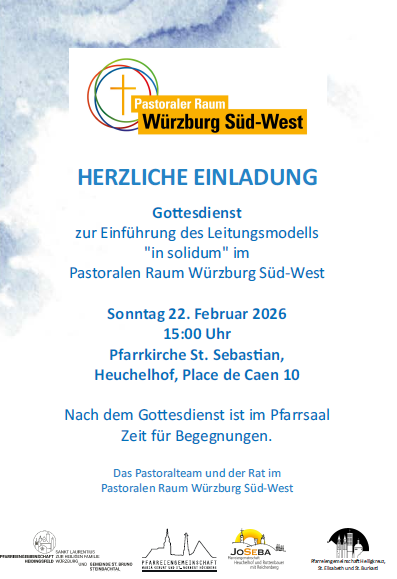 Am Sonntag, 22.02.2026 kommt Generalvikar Dr. Jürgen Vorndran in unseren Pastoralen Raum Würzburg Süd-West und wird hier in der Pfarrkirche St. Sebastian (Heuchelhof) die Einführung in die solidarisch pastorale Verantwortung vollziehen. Dieses "in solidum" genannte Leitungsmodell bedeutet, dass die gemeinsame Hirtenseelsorge für alle Pfarreien im Pastoralen Raum Würzburg Süd-West gemeinsam den Pfarrern Klaus Höstery, Stefan Michelberger und Gerhard Spöckl übertragen wird.