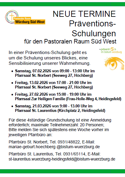 Im Bistum Würzburg und in unserem Pastoralen Raum Würzburg Süd-West wollen wir eine sichere Kirche für alle sein. Diese Haltung bedeutet ein klares Bekenntnis zu Prävention, Intervention und Aufarbeitung sexualisierter Gewalt in der Kirche. In allen Pastoralen Räumen gibt es darum Angebote, um die Ehrenamtlichen zur Sensibilität zu schulen, die es braucht, um missbräuchliches Verhalten zu erkennen und darin nicht ohnmächtig, sondern handlungsfähig zu werden. Daher wollen wir Sie auf untenstehende Präventionsschulungen aufmerksam machen, die wir erneut in der nächsten Zeit anbieten: